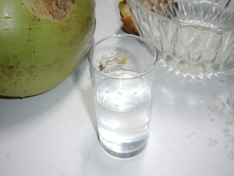 椰子の実ジュースを器に取り出して、早速試飲してみる。なるほど、確かにスポーツドリンクの味がする。ほんのり甘みがあるようで甘すぎず、労働後の喉の渇きを癒してくれる。