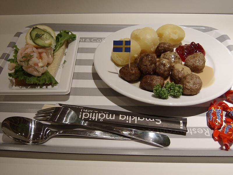 軽く2時間ぐらいいただろうか。疲れたのでちょっと休もうとレストランに入ってみる。スウェーデン料理の店らしく、とりあえずミートボールと海老のサンドイッチを頼んでみた。